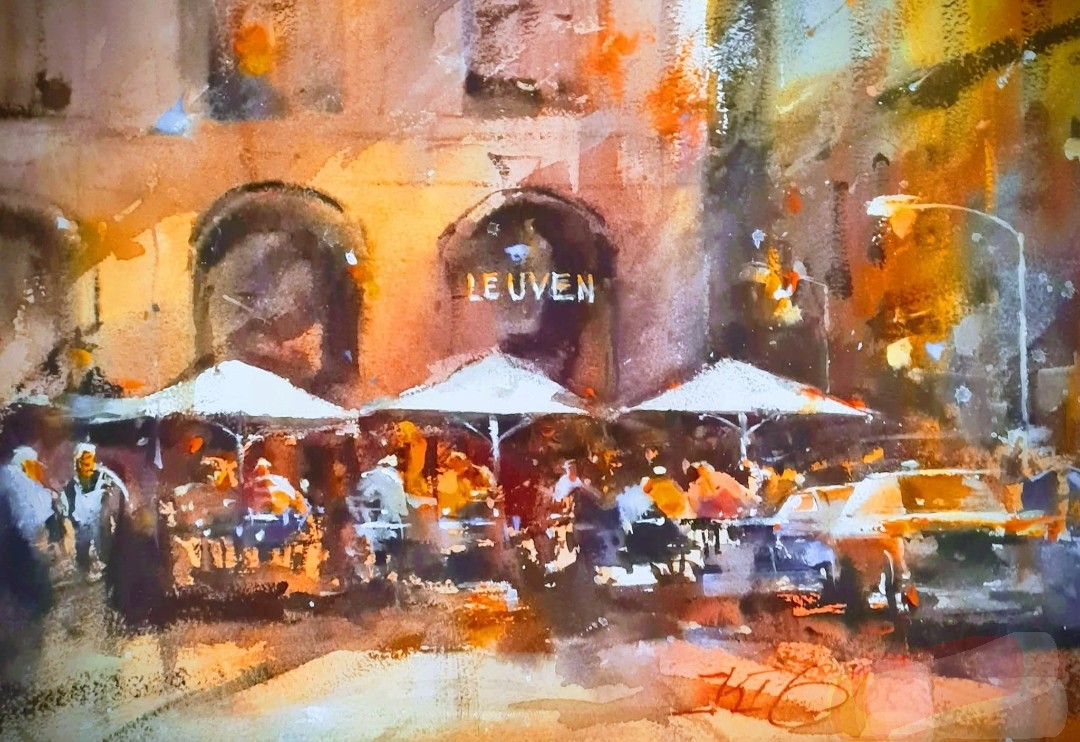 Artist’s comment:This vibrant watercolour captures the lively atmosphere of Leuven Bar in Wellington. With expressive brushwork and a warm palette of golds, ambers